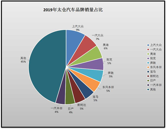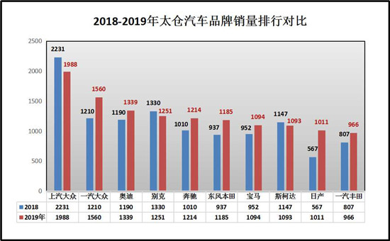 在品牌销量上:上汽大众、一汽大众、奥迪、别克、奔驰、东风本田、宝马、斯柯达、东风日产、一汽丰田、分别以:1988台、1560台、1339台、1251台、1214台、1185台、1094台、1093台、1011台、966台排名太仓品牌销量的前十。