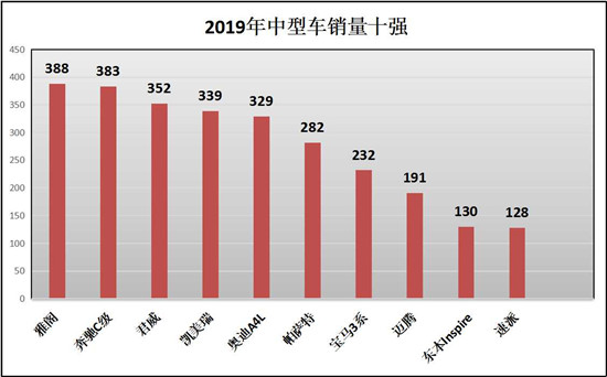 在中级车销量排行上:雅阁、奔驰C级、君威、凯美瑞、奥迪A4L、帕萨特、宝马3系、迈腾、东风本田inspire、速派分别以:388台、383台、352台、339台、329台、282台、232台、191台、130台、128台荣获太仓中型车销量的前十。