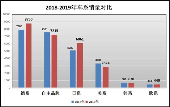 在系别对比上,德系、自主品牌、日系依然三分天下,德系与日系上涨较多,其中德系品牌上涨10.93%,日系上涨19.1%,自主品牌虽有4.5%的下滑,但市场份额依然依然不少。美系下降最多在17.14%,韩系及其他欧系销量已经不值一提。
