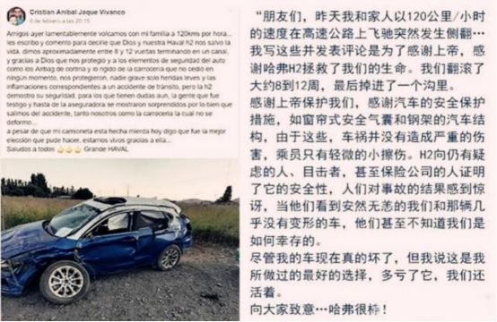 此外,两年前的智利还出现过另外一起险情,一位名叫克里斯蒂安的哈弗H2车主及家人遭遇严重侧翻的事故,车辆翻滚至少8周,而在发生事故的第一时间,车辆安全气囊全部打开,最大程度减少了对车内成员的伤害,车上成员仅受轻伤,事后对哈弗H2的安全品质给予了极高的评价。而这也是基于哈弗H2配备的前双气囊+前双侧气囊+一体化气帘,这样丰富、全面的气囊配置市面少有,当意外发生时,能够极大缓解驾乘人员受到二次伤害,为行车安全多上一层保险。