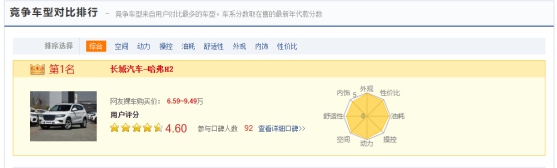 而在易车的车主点评中,哈弗H2同样得到了9.89分(10分制)的行业高分。在消费者满意度方面,其空间、外观、内饰、动力、操控……纷纷榜上有名,赢得大批拥趸的青睐,哈弗H2也成为小型SUV市场的流量先锋。