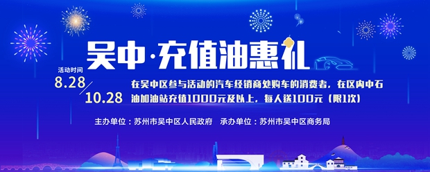 8月28日-10月28日,凡在吴中区参与活动的汽车经销商处购车的消费者,凭购车发票或合同到吴中区中石油加油站办理油卡,享充值1000元及以上,送100元优惠活动,每人限一次,名额有限,兑完即止。